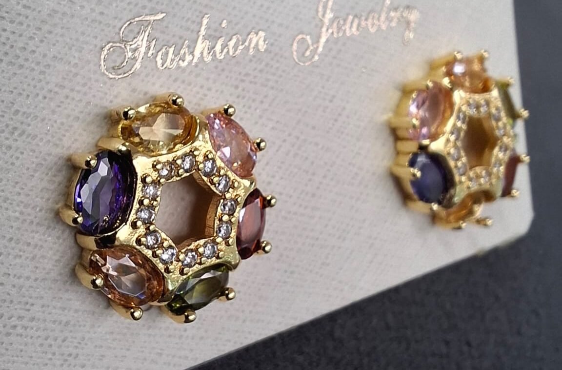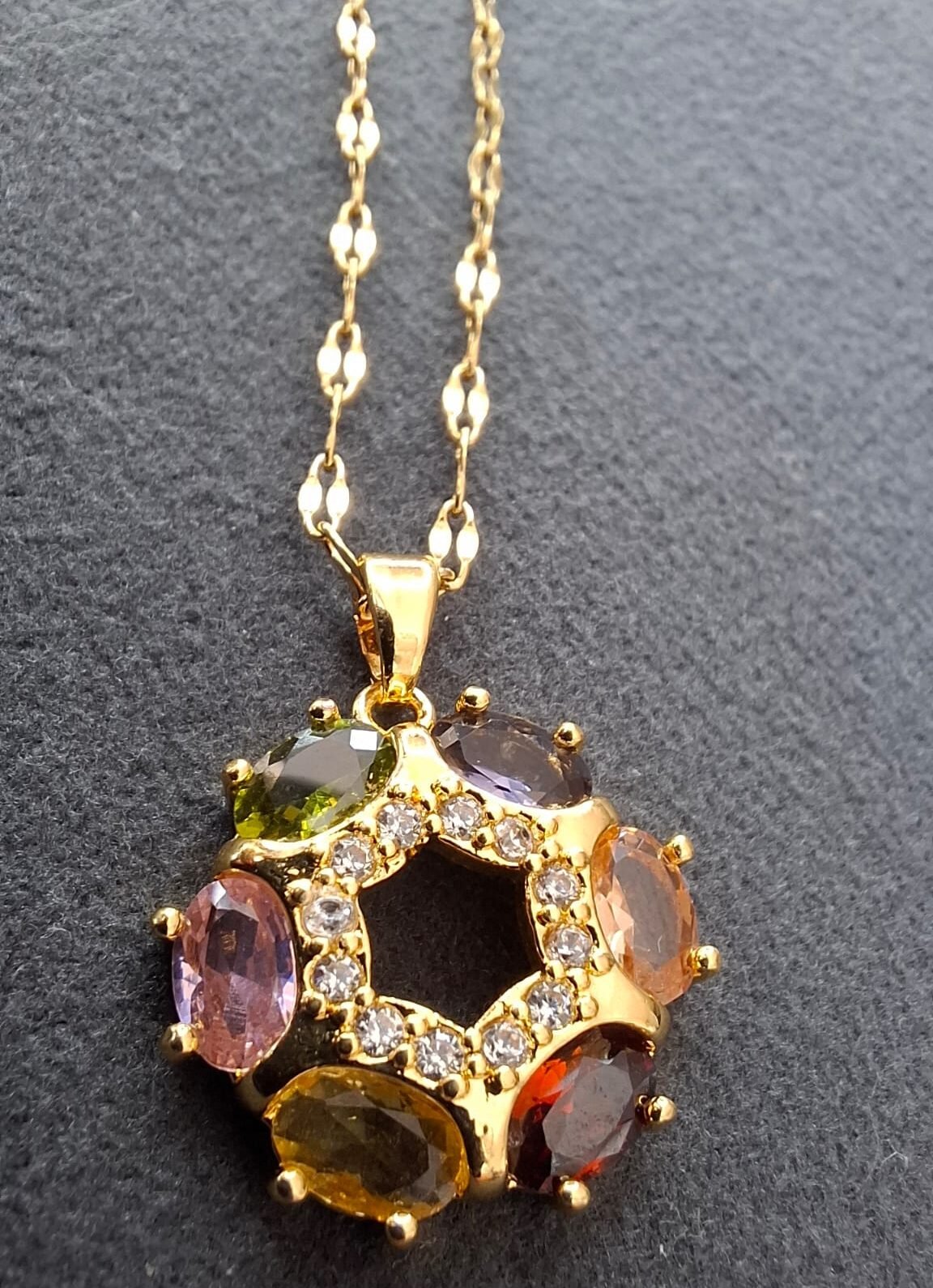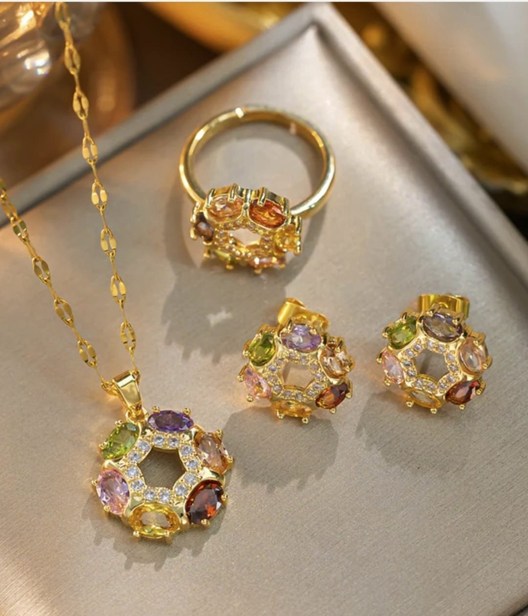 Conjunto de acero inoxidable color oro con cristales de colores, incluye pendientes, anillo y cadena con colgante