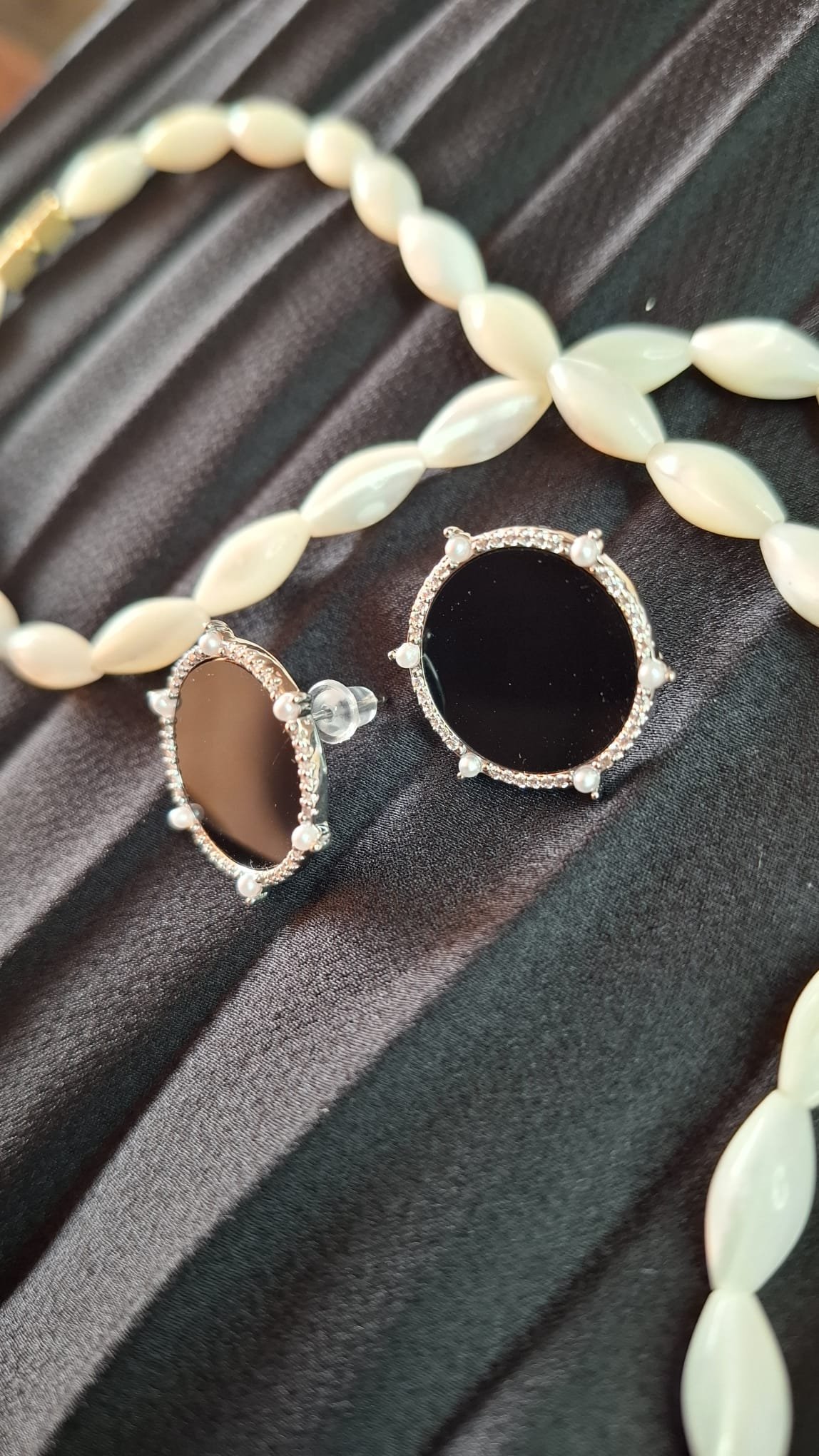 Pendientes de color plata Botón negro con 6 perlas